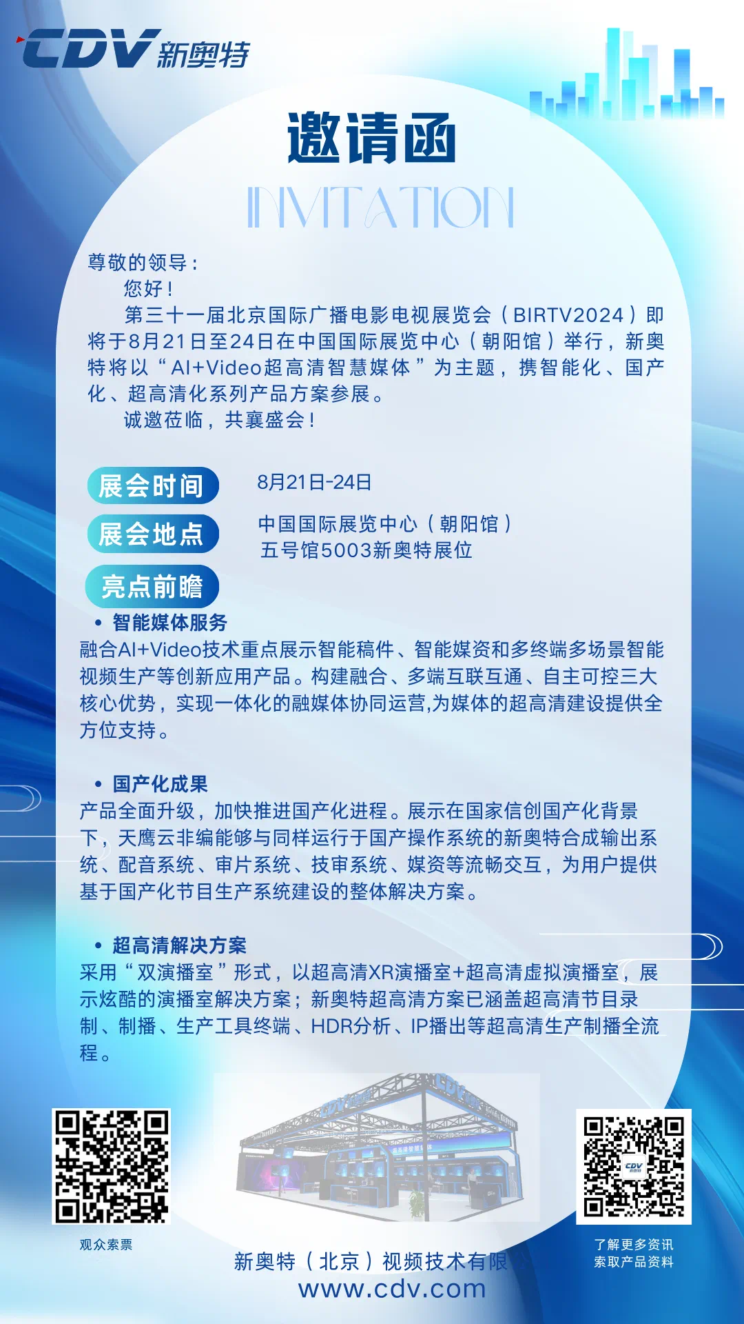 一年一度的行业盛会即将来临,BIRTV2024展会将于8月21日在北京国际展览中心开幕,新奥特诚挚地邀请您共聚北京,共襄盛举!